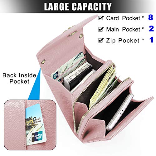 HNOOM Crossbody Telefoontas Vrouwen Echt Lederen Telefoontas Kleine Mobiele Telefoon Crossbody Schoudertas Portemonnee met 8 Kaartsleuven Multi Compartiment Telefoon Portemonnee Tas met Schouderriem, roze, L