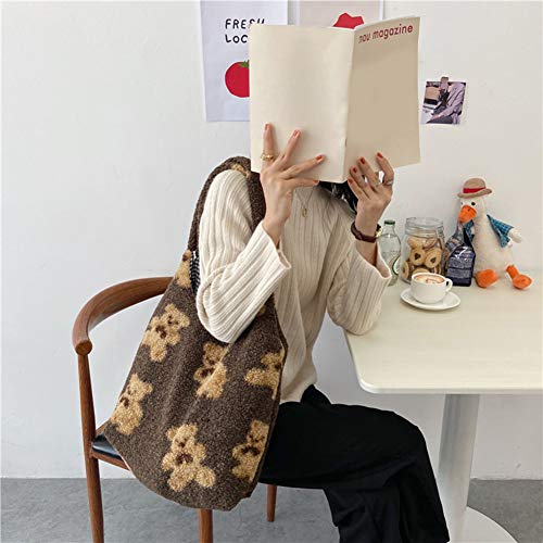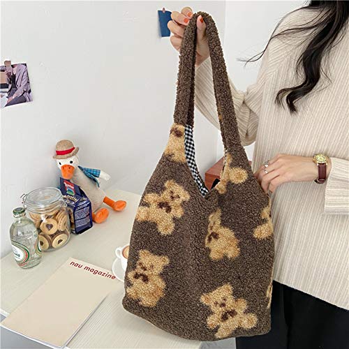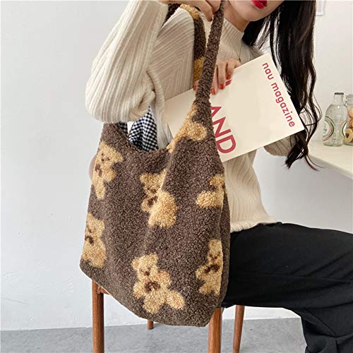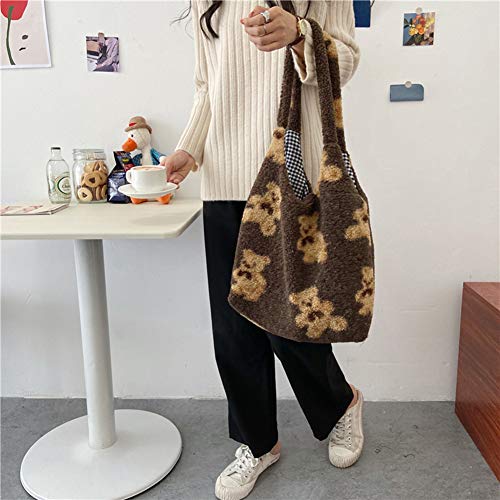 Draagbare schoudertas voor dames en meisjes, cartoonbeer-print, fleece, grote capaciteit, shopping handtassen