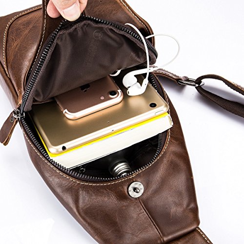 [AFMETING:6.3″*11.81″*3.15″(L*H*W), 18oz, STRAP LENGTH: 51″]: Deze borstzak is een mini-rugzak, maar het is een geweldige maat om mee te nemen naar een dagtocht of winkelen. De tas kan worden gedragen met de D-ring of verstelbare schouderriem. Materiaal buitenkant: echt leer.