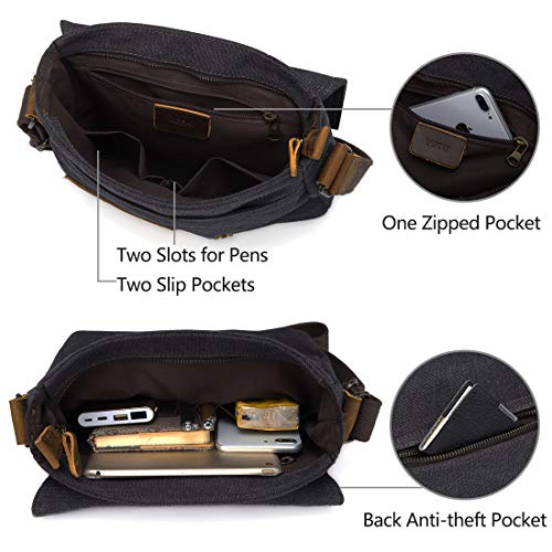 ✔️Ruim compartiment: canvas schoudertas heeft twee hoofdcompartimenten. Het hoofdvak wordt afgesloten door een centrale ritssluiting. Er zijn twee vakken, twee pennenvakken en een binnenvak met ritssluiting in het hoofdvak. Het voorvak onder het deksel is voor een gemakkelijk toegankelijk item. Er is ook een anti-diefstal zak met ritssluiting aan de achterkant, die is met een leren trekker.